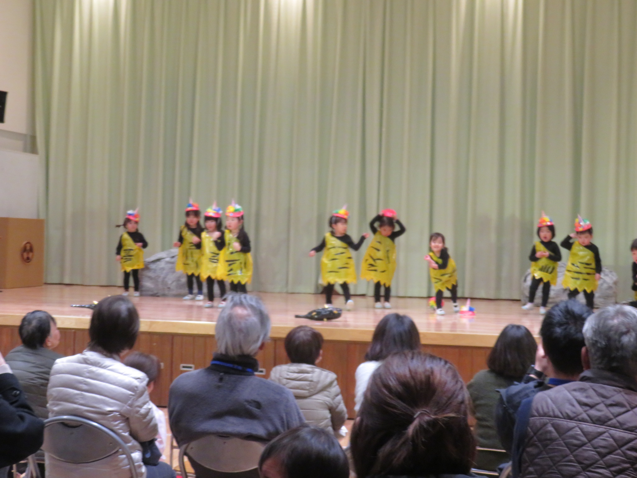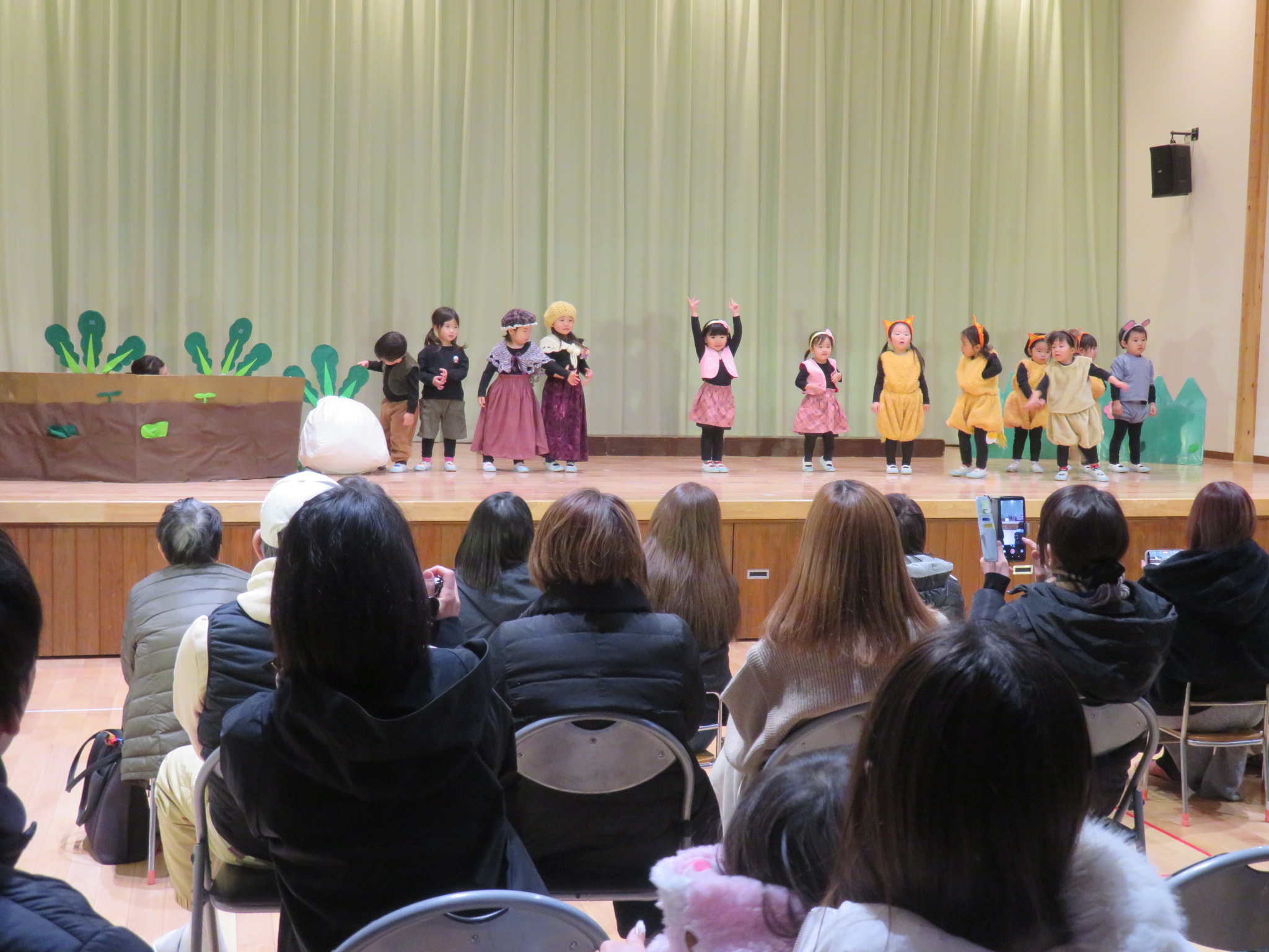 満3歳児クラスのもも組が、2月3日に発表会を行いました。 園のホールで2つのプログラムを発表しました。 ひとつめは、お話の劇『大きなかぶ』です。 子ども達は衣装を着てCDに合わせて演じました。