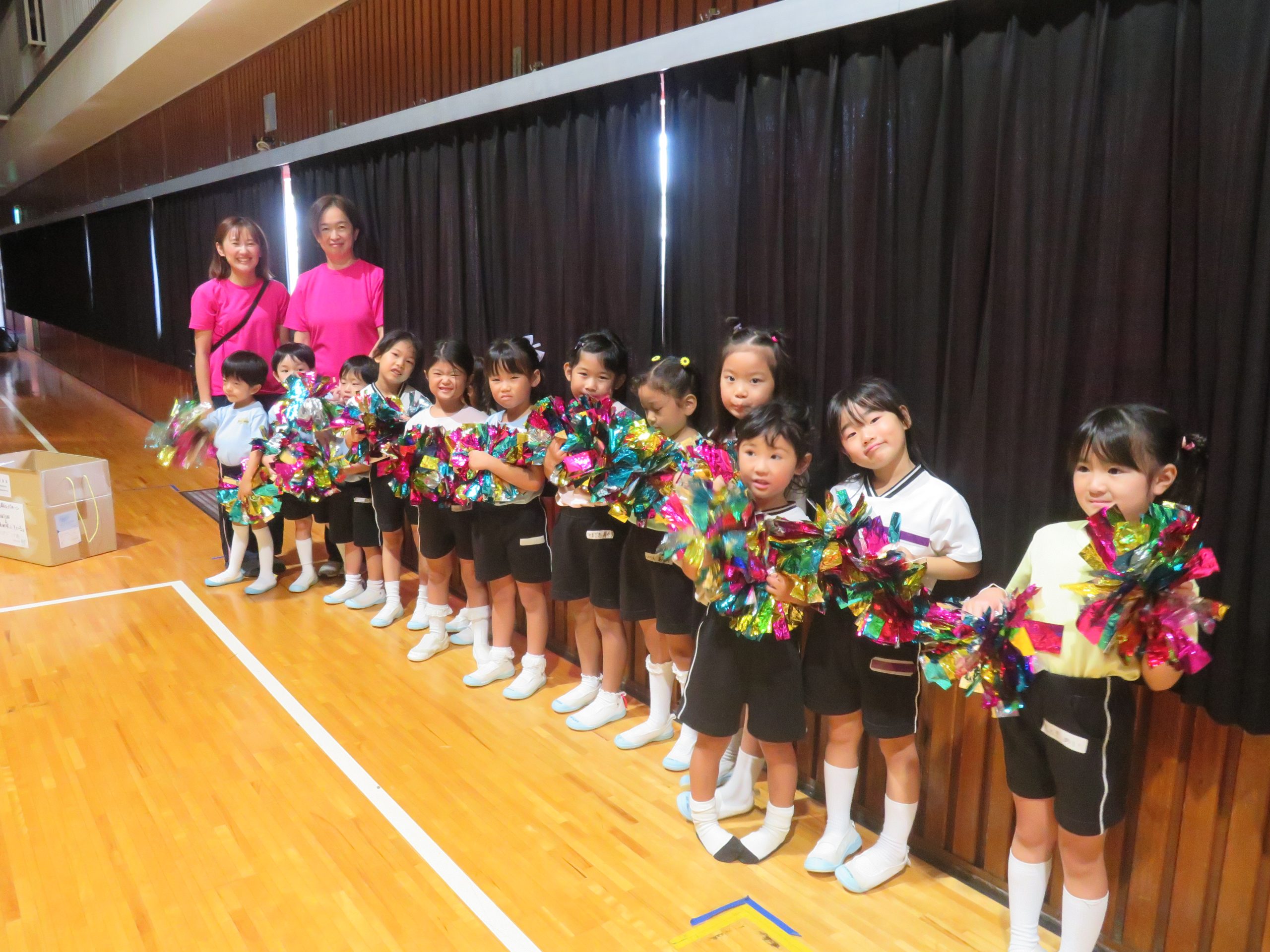 子ども達は手にキラキラのポンポンを持ち、市役所の方の誘導で舞台の前に行きました。